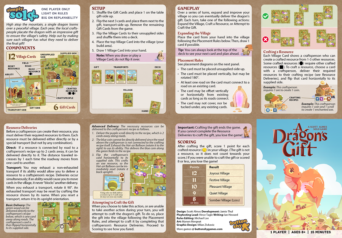 High atop the mountain, a single dragon looms over a peaceful village. Each year, the local craftspeople placate the dragon with an impressive gift to ensure the village's safety. Help out by making sure each villager has what they need to deliver the final gift!