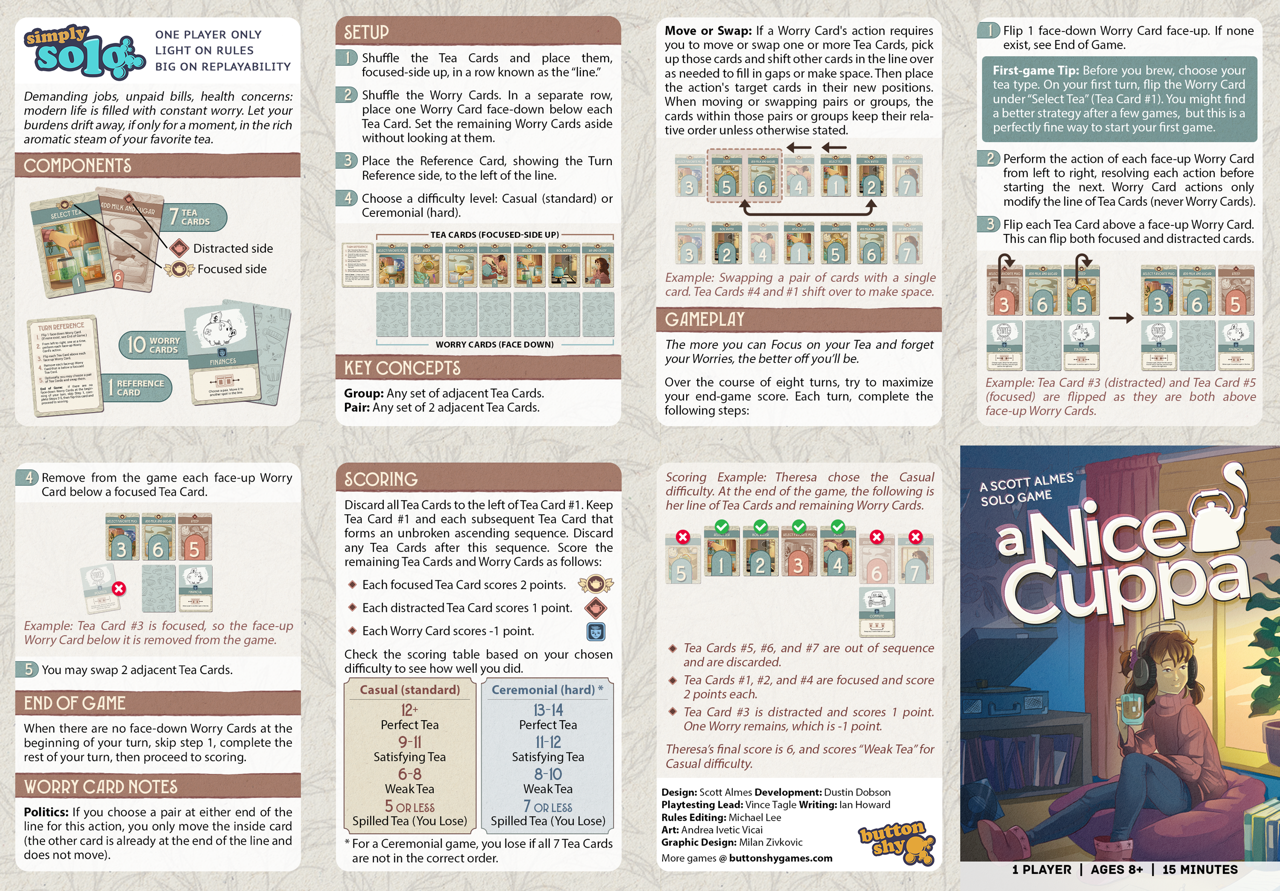 A Nice Cuppa is the seventh game in Button Shy’s Simply Solo series. The game tasks the player with managing Worries through careful card management across 8 turns. As Worries are revealed, they complicate your life and force you to become distracted. Focus on your tea to eliminate those pesky problems and soothe your shattered nerves. Once your tea is ready, evaluate how you did.