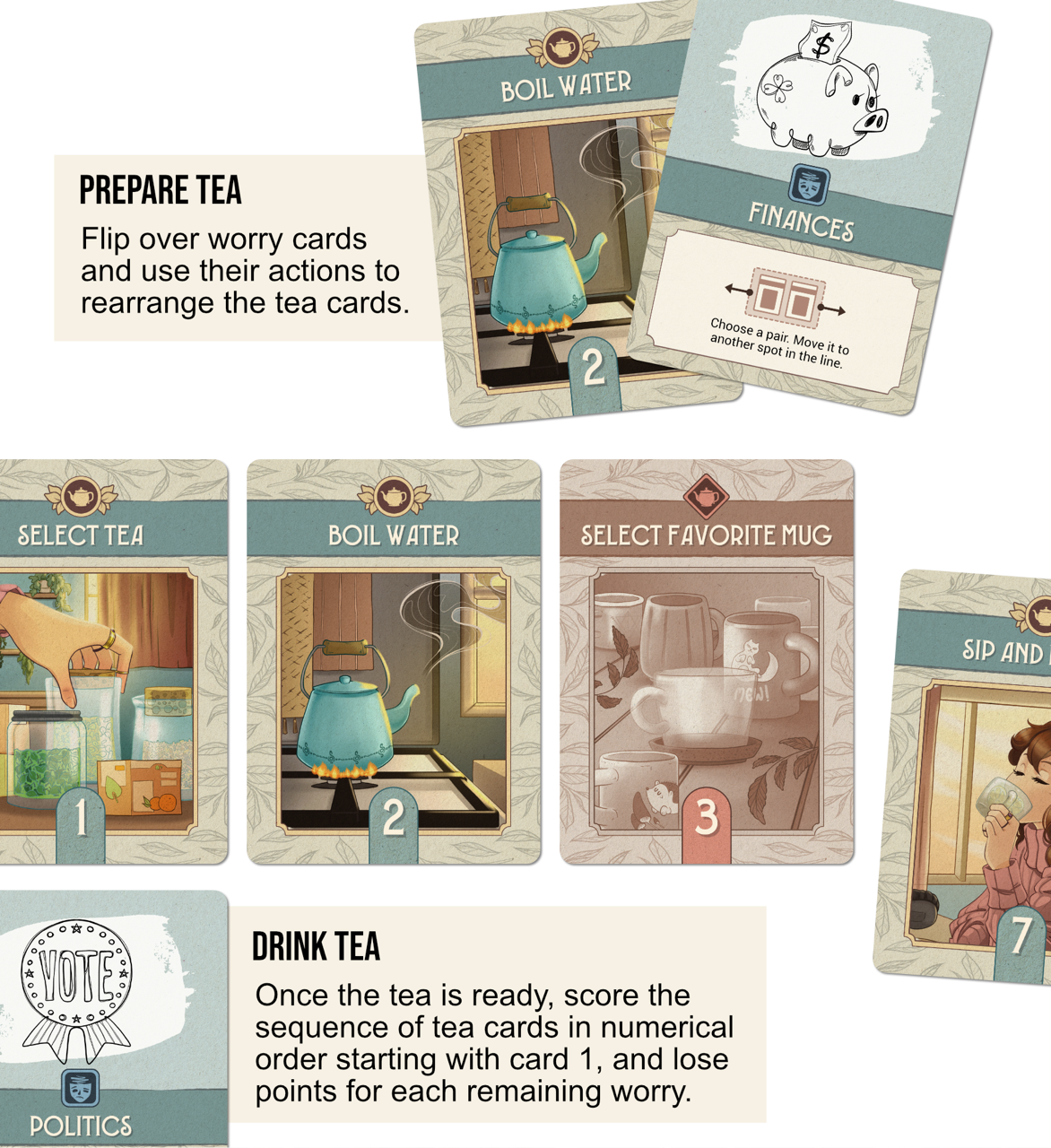 On your turn, first flip over a single face-down Worry. Then, in sequence from left to right, resolve each face-up Worry. These force you to rearrange your Tea cards in various ways, and you'll need to plan carefully to keep them from messing up your well-laid plans.