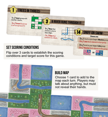 Each turn, players will play one card from their hand to the growing landscape, trying to score as many points as possible. Players will have to communicate and plan without revealing their own cards in order to most efficiently develop large areas in each of the 4 zone types. Watch out though, road maintenance isn't cheap and each road will cost you points in the end. This is doubly true with Naturopolis’ double-lined roads as they will cost you -2 points each!