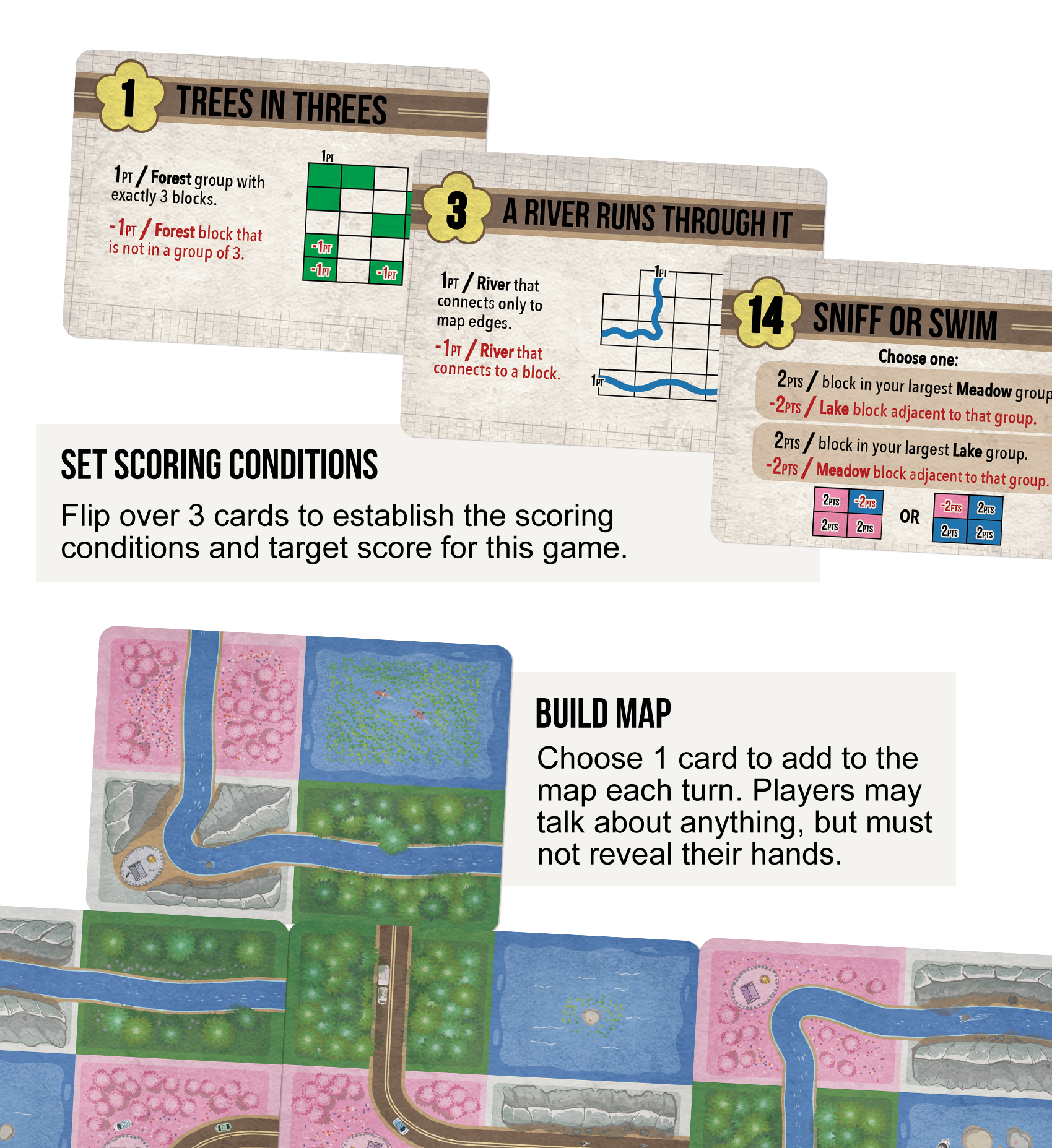 First, players will randomly flip over 3 cards to see the scoring rules for the game. But not only do these 3 cards determine how you will score this game, they also determine how you win. Total up the values of all three cards, and that number is the scorethat you need to reach in order to win. Each game has drastically different scoring rules in unique combinations, and a new score to beat, ranging from 6 to 51 points.