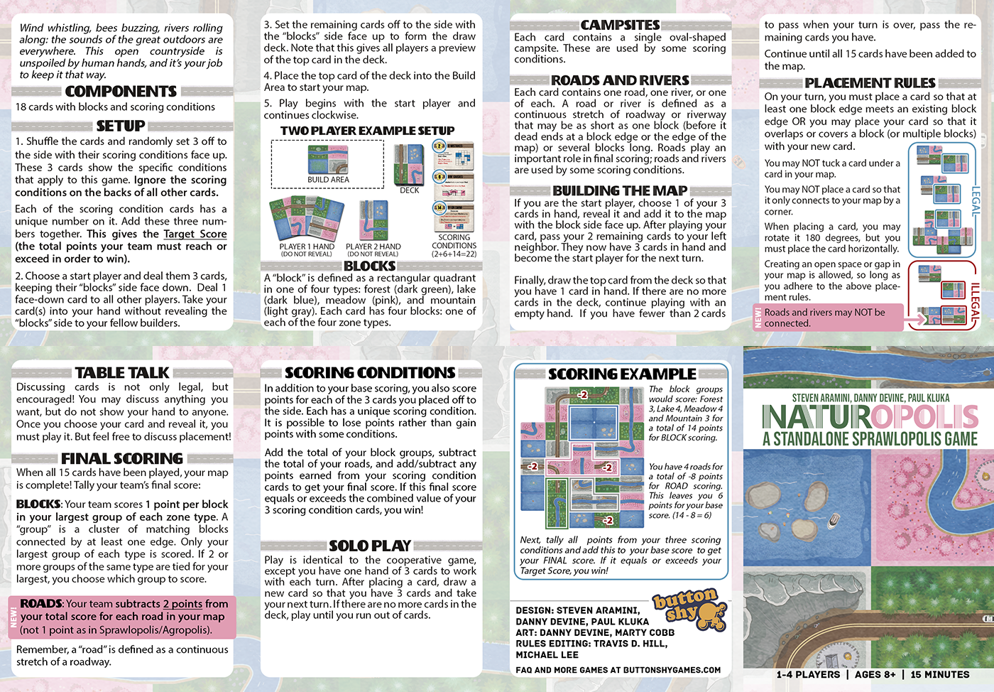 Naturopolis is the 3rd game in our series of standalone and combinable Sprawlopolis games. It brings mountains, lakes, forests and meadow blocks to the game, with the added bonus of campsites (which trigger scoring conditions), rivers (which also trigger scoring conditions and cannot connect to roads) and double line roads (which are worth -2 points each as disrupting nature is very costly!)