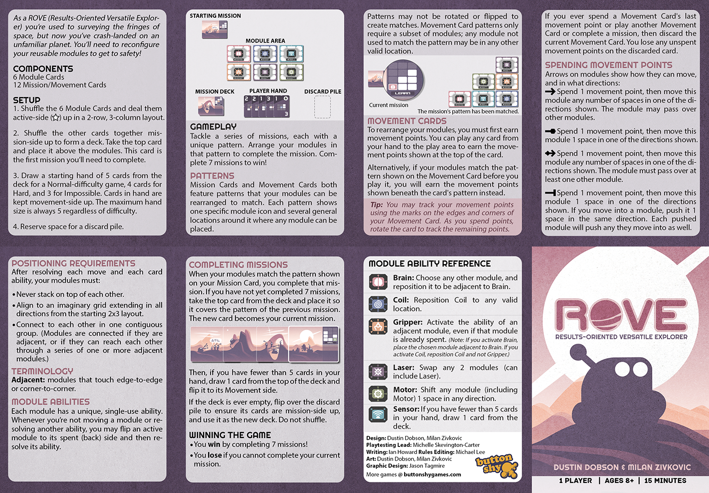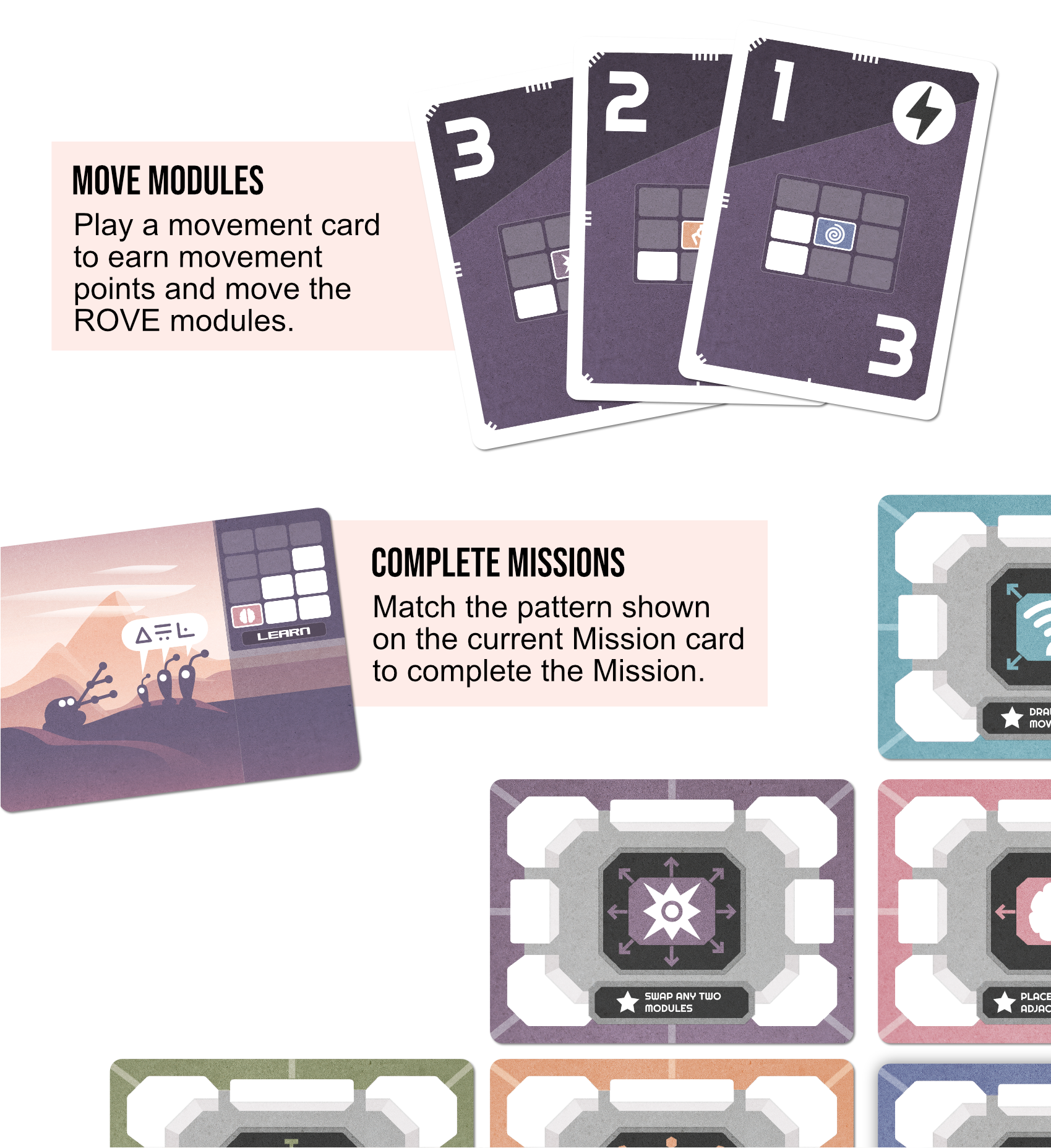 ROVE is a solo spatial puzzle game. In each game of ROVE, the player will face a series of mishaps that can only be solved by arranging the 6 module cards in a specific pattern. Moving a module requires Movement Points gained by discarding cards from hand for the listed amount. Players may gain additional Points if their current module layout matches the pattern shown on the discarded card.