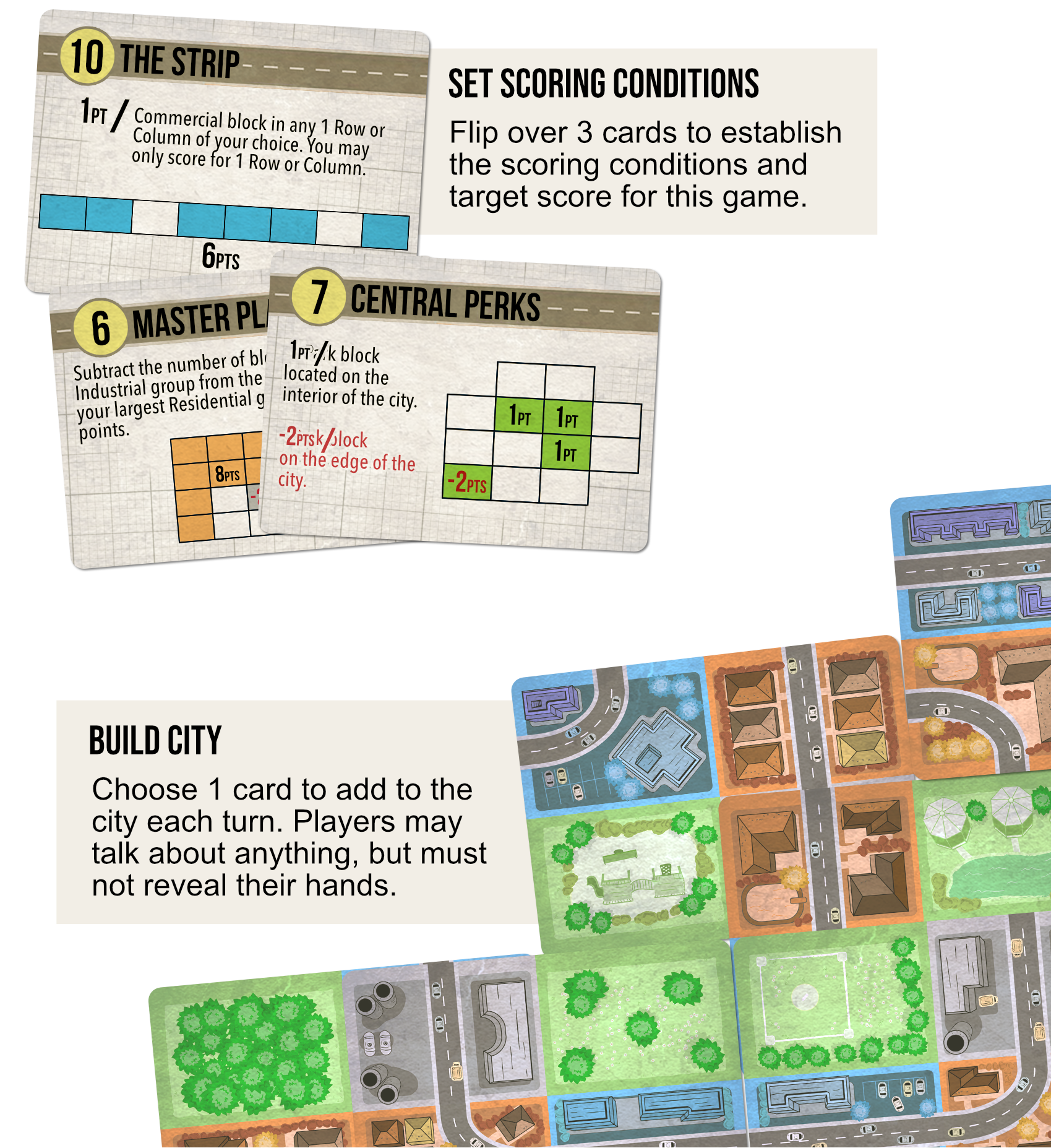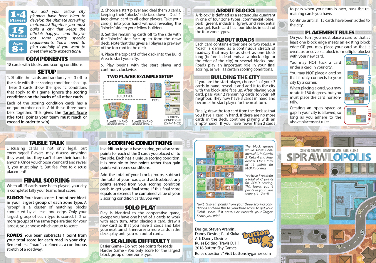 In Sprawlopolis, 1-4 players work together to build a new city from the ground up. Using only 18 cards and a variable scoring system, the game is never the same twice. Each turn, players will play 1 card from their hand to the growing city, trying to score as many points as possible. Players will have to communicate and plan without revealing their own cards in order to most efficiently develop large areas in each of the 4 zone types. Watch out though, the city hates paying for road maintenance so each road will cost you points in the end. When all cards have been placed, the game ends and players see if they have met dynamically generated minimum score for their game. Can you meet the demands of the officials, work with your fellow planners and build the ultimate urban wonder? It’s time to find out!