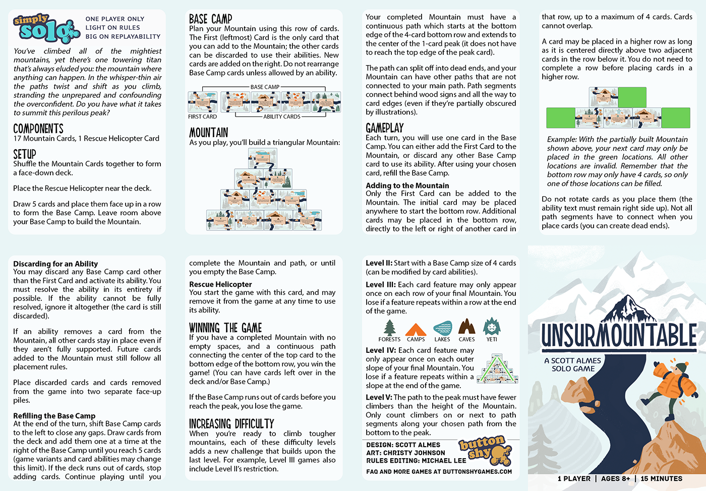 Unsurmountable is the third game in the Button Shy Simply Solo series. These are games that are one player only, light on rules, and big on replayability.